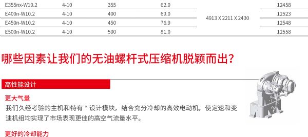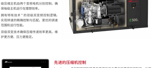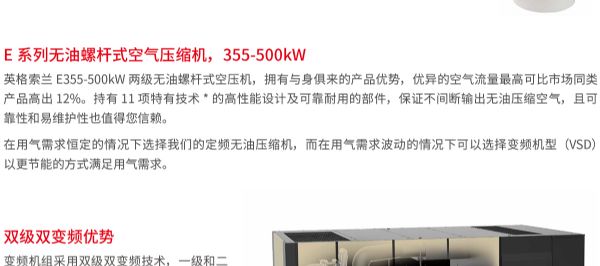 產(chǎn)品名稱:E系列355-500kW無油螺桿式壓縮空氣系統(tǒng)壓力:4-10.2bar功率:355-500kw排氣量:58.4-84.2m3/min品牌:英格索蘭