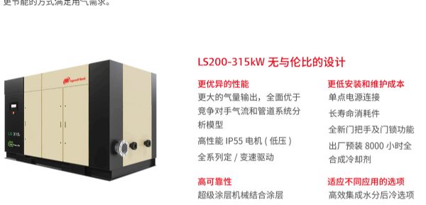 產(chǎn)品名稱:LS系列200-315kW低壓無油螺桿空壓機(jī)壓力:2.5-3.0bar功率:200-315kw排氣量:49.6-82.3m3/min品牌:英格索蘭